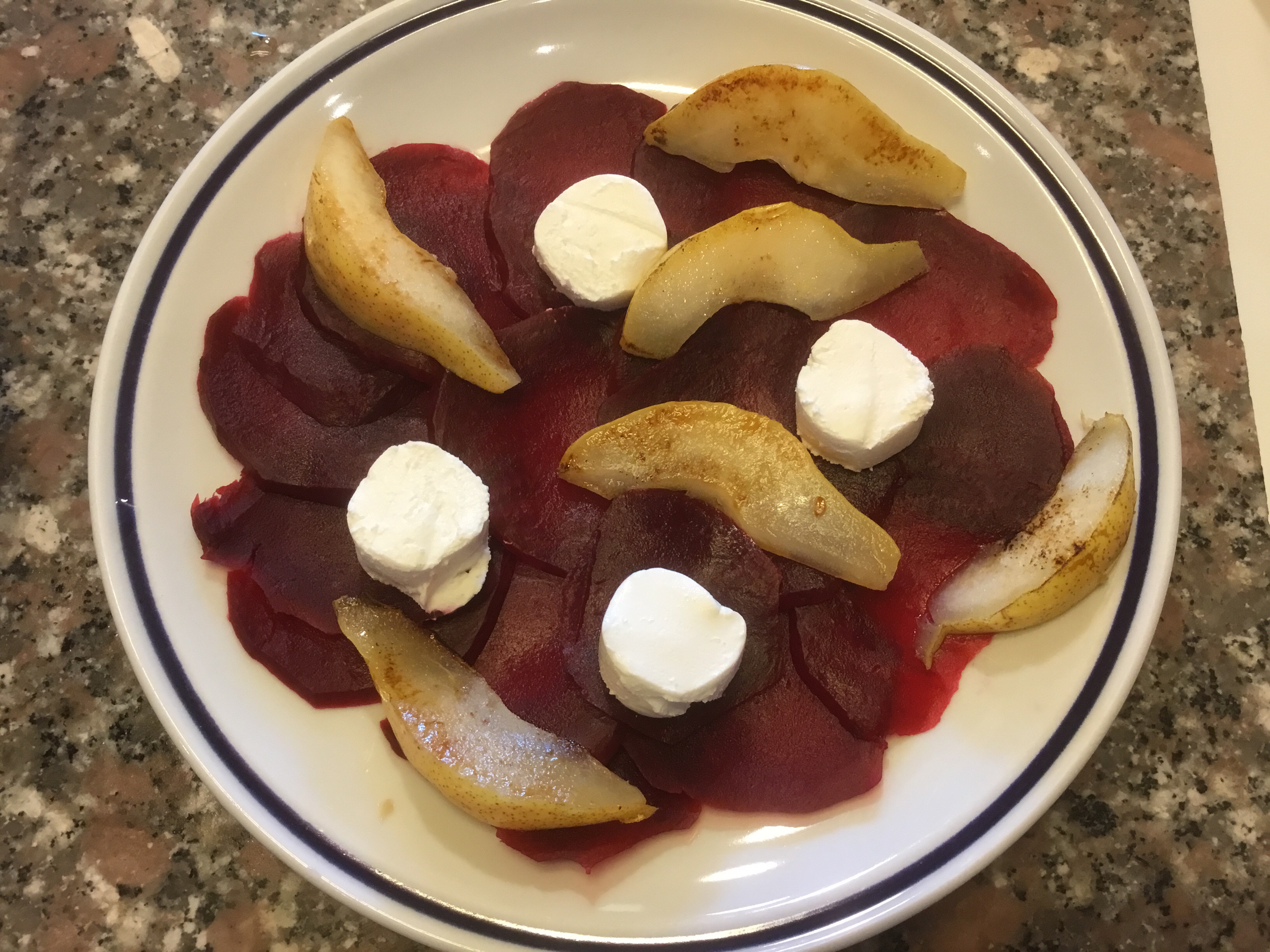 Una ricetta facile veloce che potete servire anche come antipasto lo spunto me lo ha dato una mia amica lei me lo ha proposto con i fichi ma non avendoli a disposizione ho provato con le pere e devo dire che ci stanno proprio bene, il gusto aspro del caprino dona un equilibrio perfetto con la dolcezza della barbabietola e della pera e la croccantezza dei semi di zucca accontento così anche i vegetariani