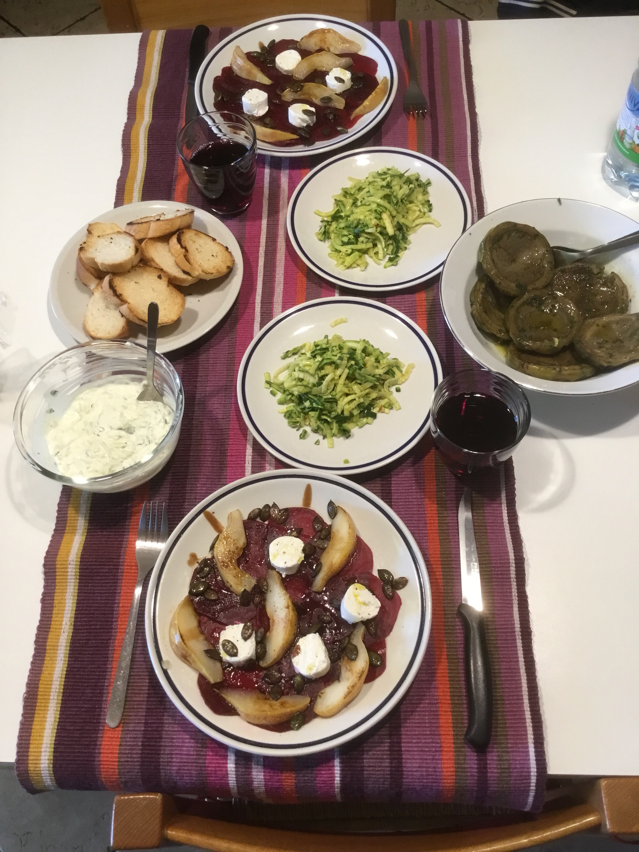 Io ho preparato un pranzo vegetariano aggiungendo dei cuori di carciofi trifolati, spaghetti di zucchine saltati in padella con olio aglio e peperoncino e crostini con salsa tzaziki