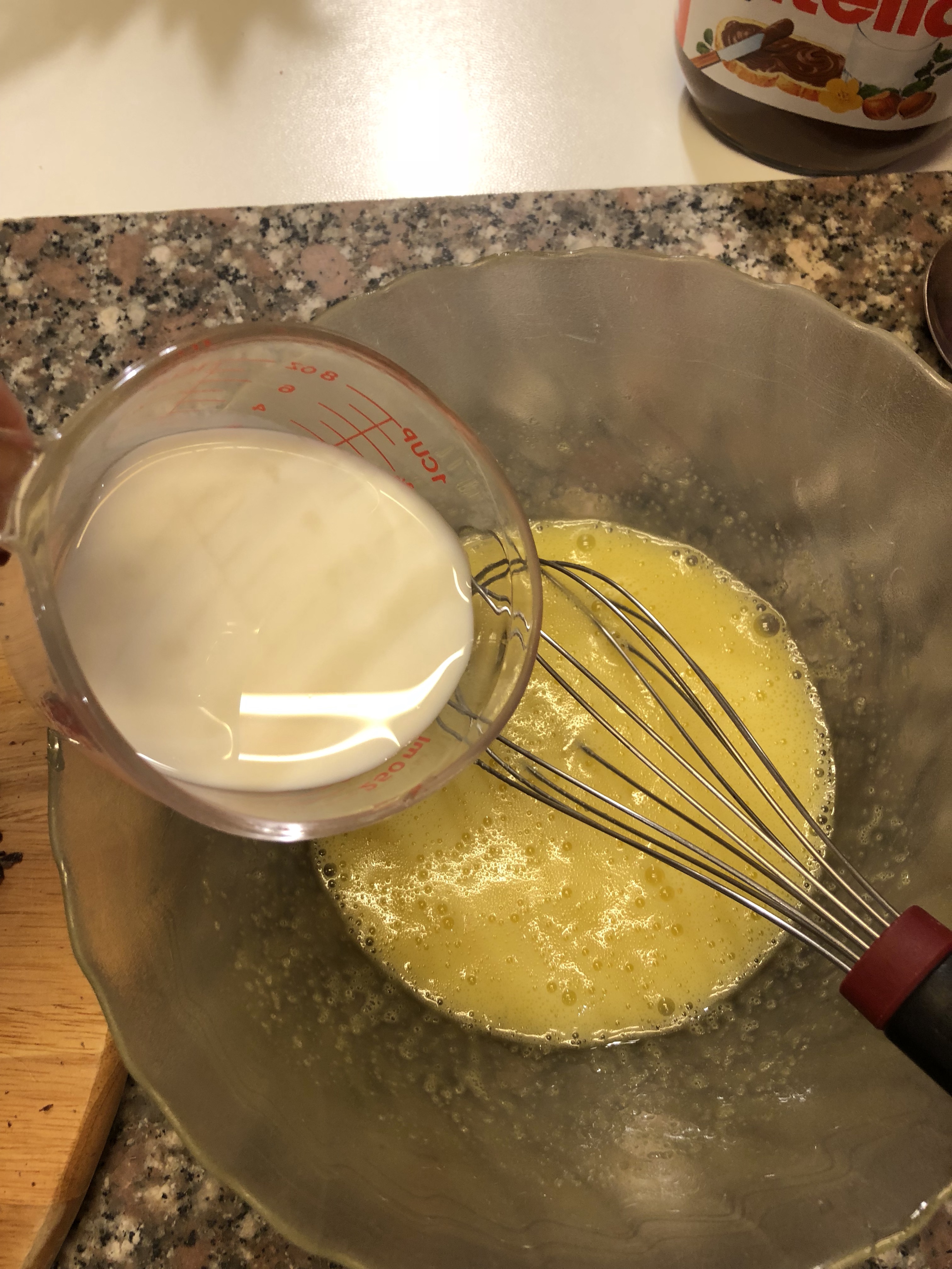In un’altra ciotola rompo le uova che devono essere a temperatura ambiente e le mescolo con una frusta insieme allo zucchero