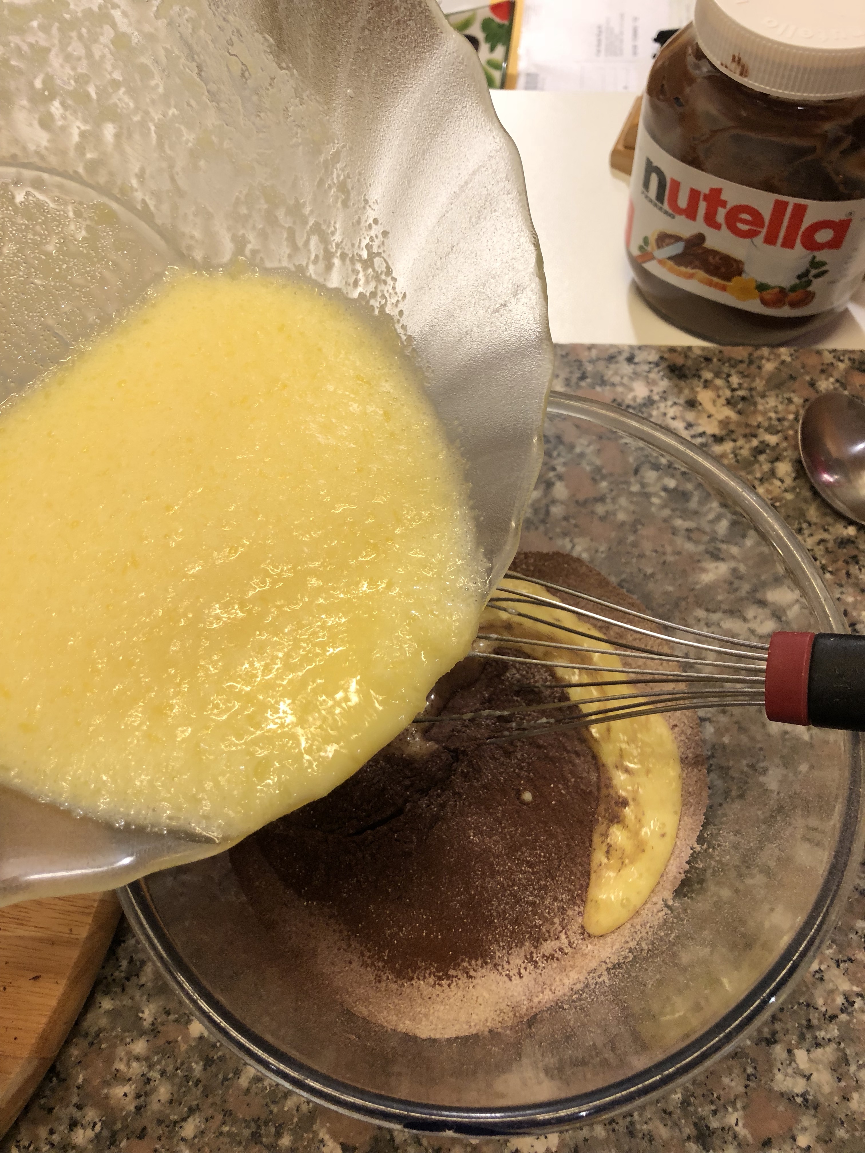 Mescolo con una spatola velocemente ricordate i muffin non vanno lavorati troppo perché diventano gommosi unisco il cioccolato, tengo da parte alcuni pezzettini di cioccolato