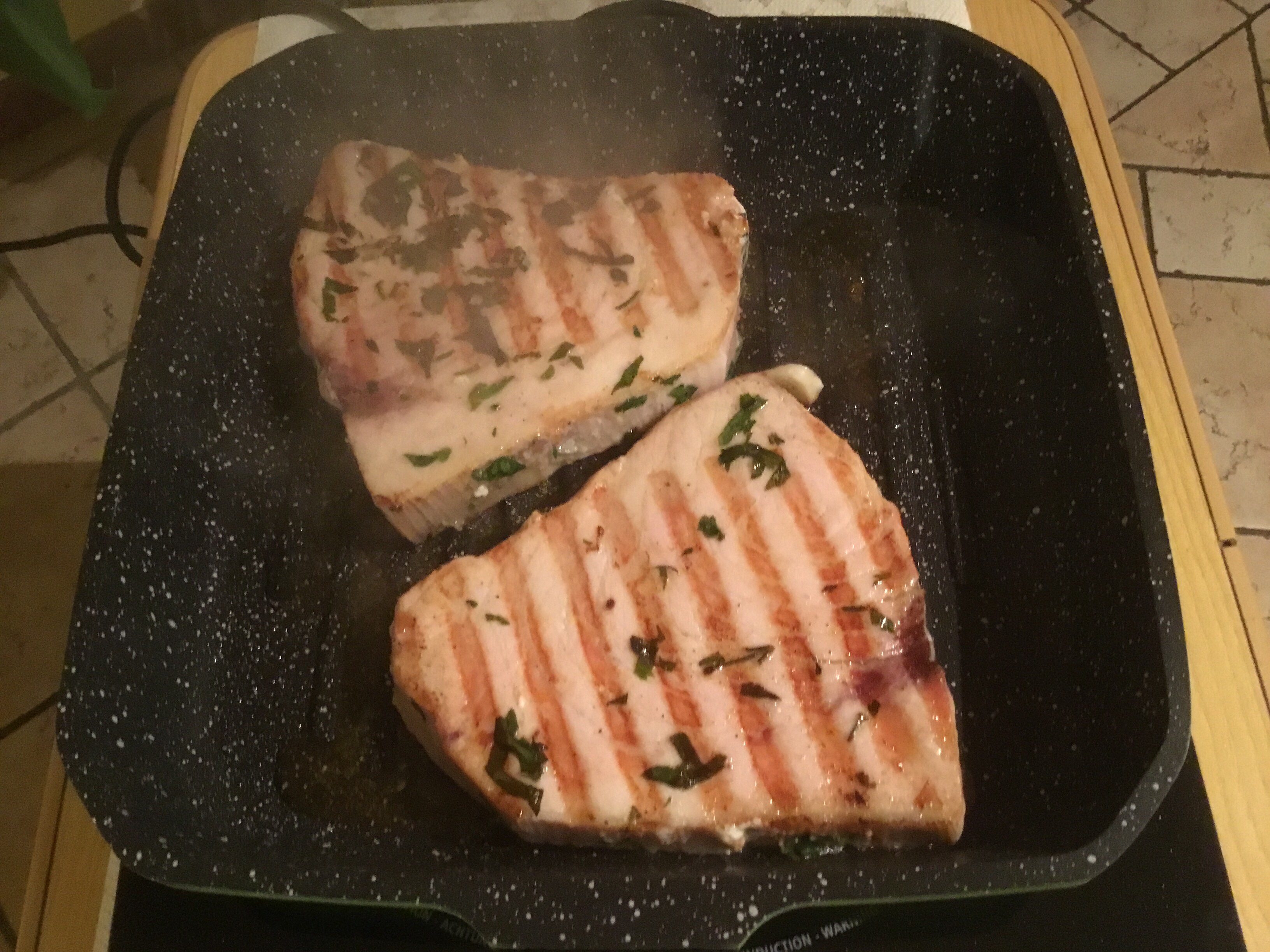 Tolgo il pesce una mezz’ora prima della cottura, scaldo una piastra e quando é bollente appoggio il pesce spada scolato dalla marinatura, cuocio per 3 minuti