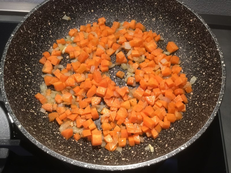 In una padella verso un goccio di olio e cuocio la cipolla e le carote lasciandole croccanti