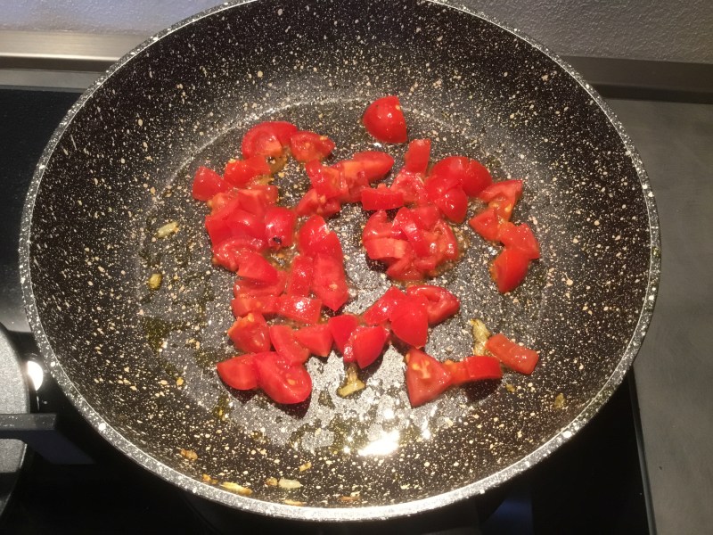 Le tengo da parte e nella stessa padella salto velocemente i pomodori e tengo da parte