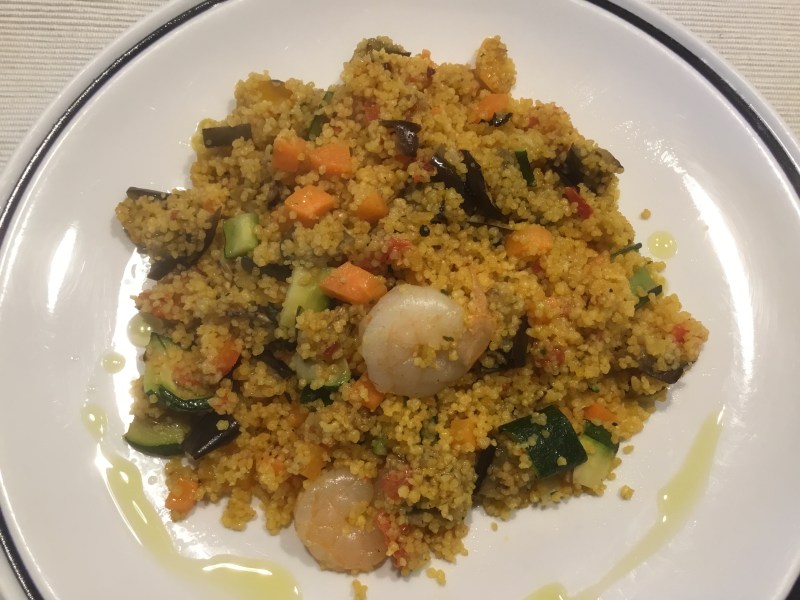 Un piatto leggero dal profumo e dal gusto intenso, io ho utilizzato un cous cous già speziato, se non lo trovate, aggiungete voi le spezie che più vi piacciono, curcuma, curry, paprica…..Se poi lo volete vegetariano eliminate i gamberi