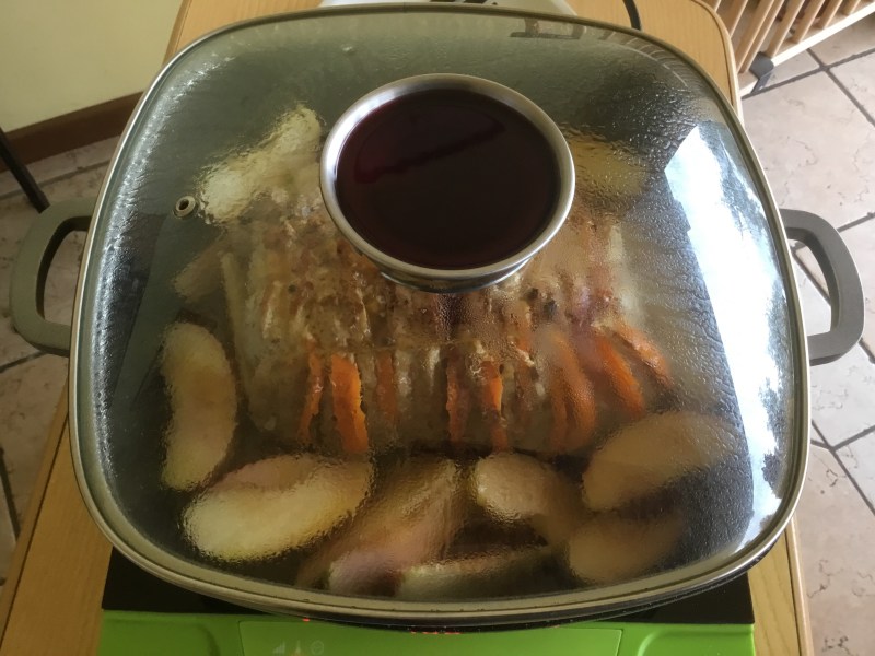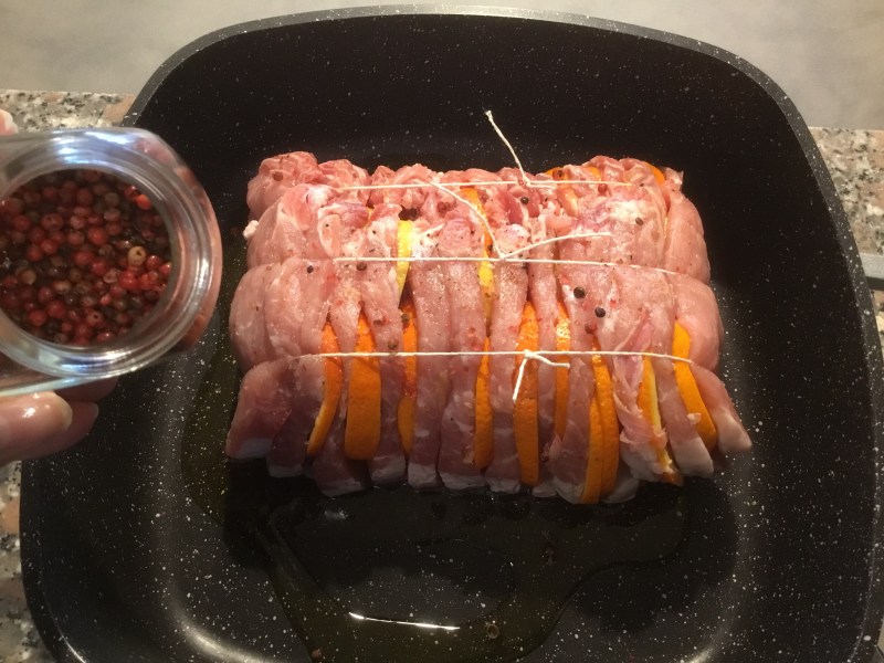 Farcisco ogni fetta di carne con mezza fettina di pancetta, 2 fettine di arancia e 1 di limone alternandoliQuando é tutta farcita chiudo bene e lego con spago da cucina fissandola in più puntiIn una larga padella verso un filo di olio, lo scaldo e lascio rosolare la carne in tutti i lati, aggiungo del pepe rosaSpremo un arancio e un limoneSfumo con il succoAggiungo il mieleCopro e lascio cuocere circa mezz’ora aggiungendo se serve un bicchiere di acqua o brodo vegetale, intanto preparo le mele, le taglio a fette lasciando la bucciaLe aggiungo all”arrostoVerso un bicchiere di Porto e cuocio ancora per una mezz’ora, se fosse necessario aggiungo poca acquaCopro e continuo la cottura alla fine della quale controllo il sugo, se fosse troppo liquido potete addensarlo con un cucchiaino di fecola sciolto in poca acqua fredda