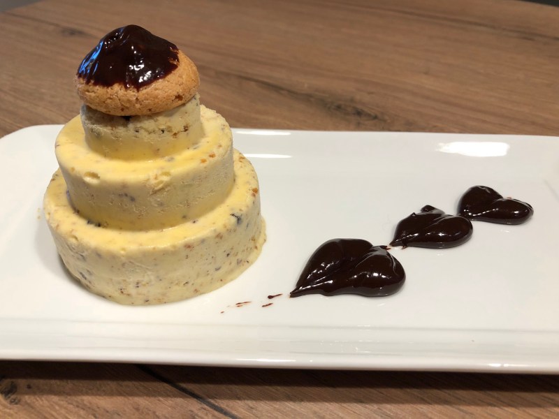 Suddivido il composto e ripongo nel congelatore, al momento di servirli li tolgo dallo stampo e li decoro con amaretti e cioccolato fondente sciolto con la panna