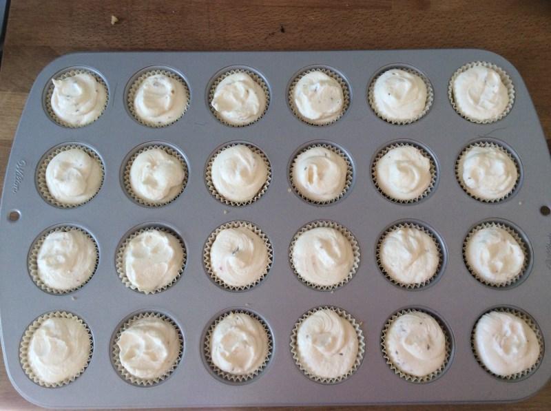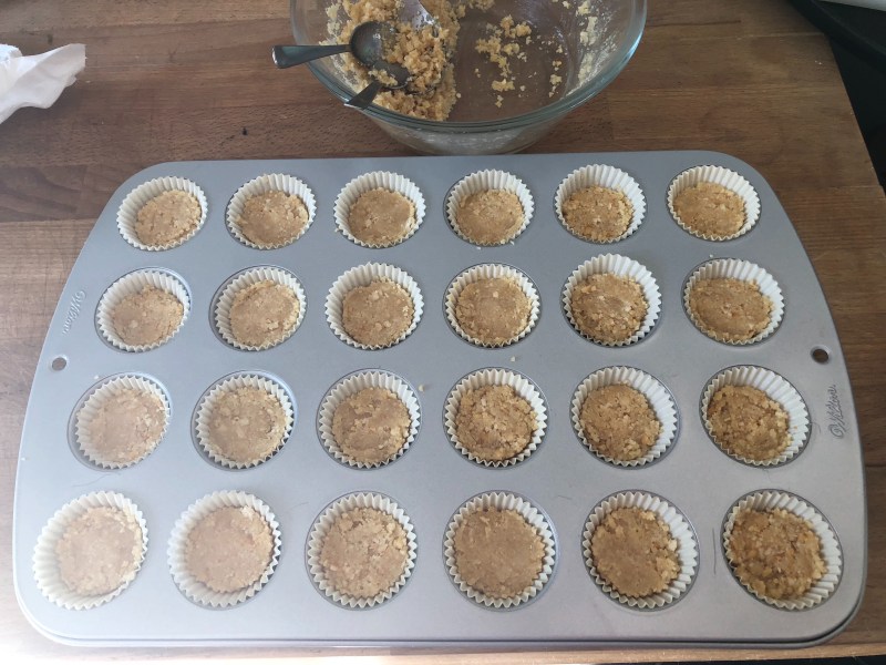 Dispongo dei pirottini di carta in uno stampo da mini muffin e verso un cucchiaino di impasto pressando bene