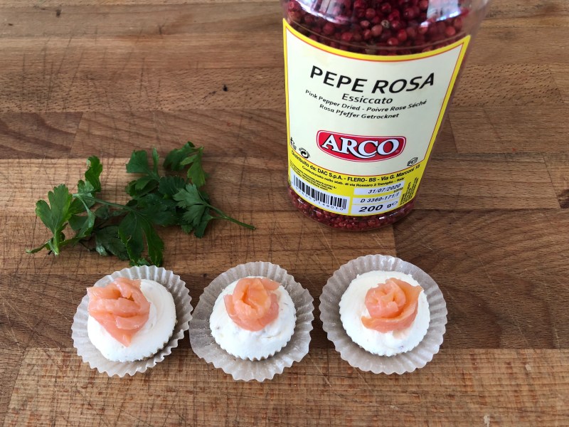 Decoro con una fogliolina di prezzemolo e un pizzico di pepe rosa sbriciolato