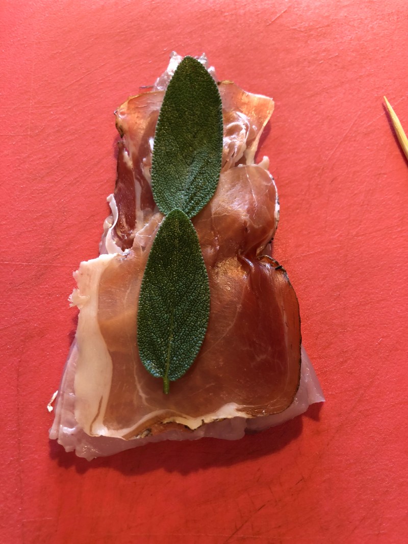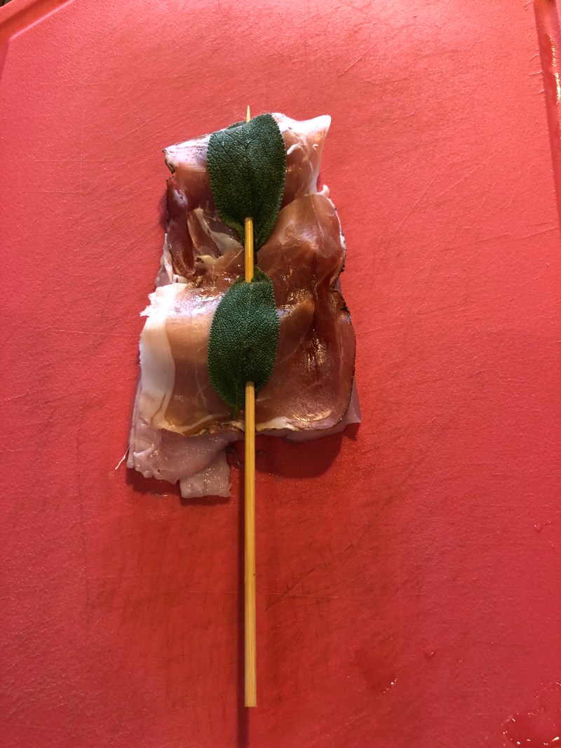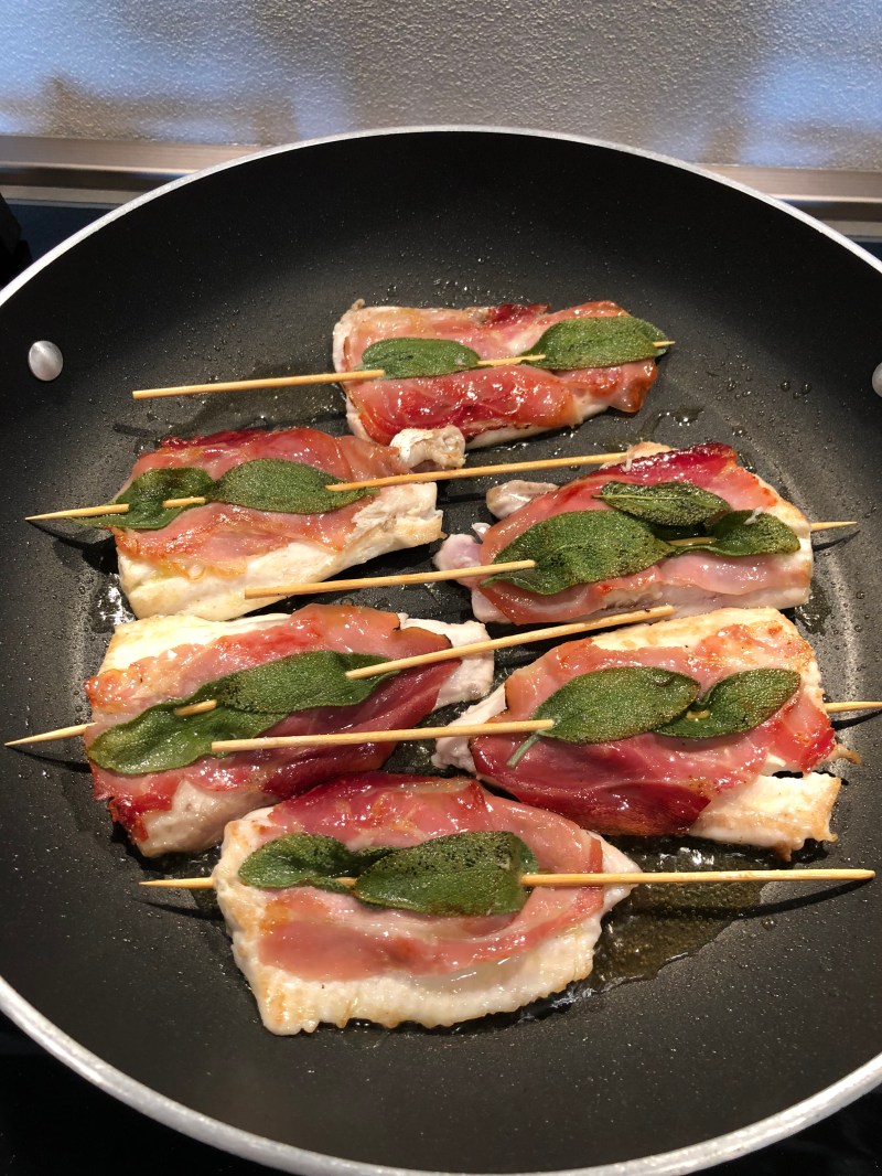 In una larga padella verso dell”olio extravergine e quando é caldo appoggio i saltimbocca dalla parte dello speck