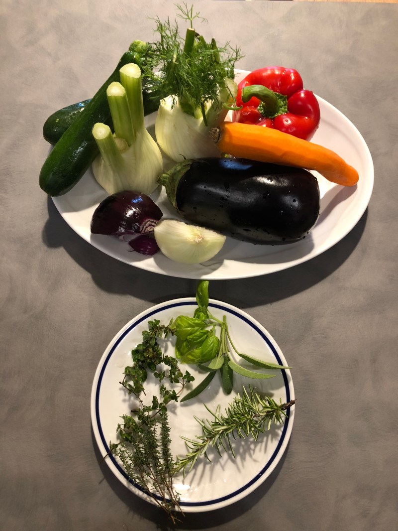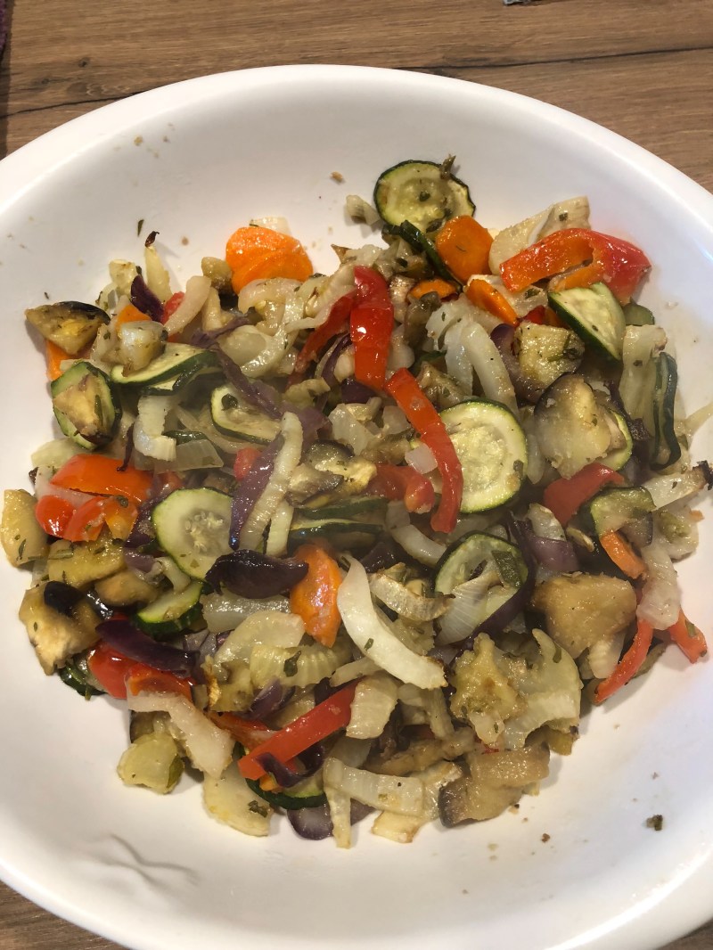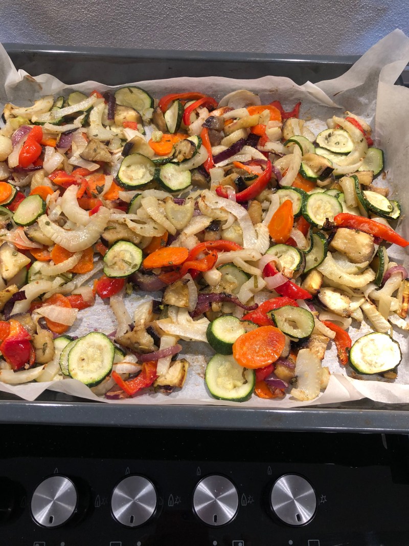 Mescolo bene potete utilizzare le mani per far aderire bene le erbe aromatiche, rivesto una teglia con carta forno e dispongo le verdure, spolverizzo con il pane grattugiato e Inforno a 180 gradi per circa 30 minuti