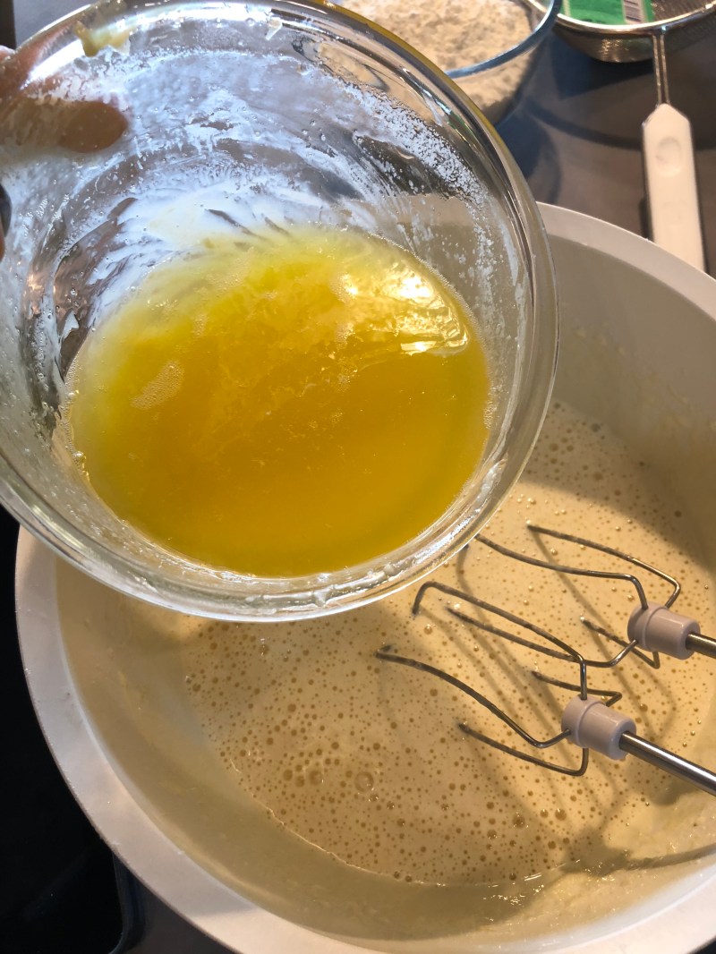 In una ciotola rompo le uova e le monto con le fruste elettriche finché diventano chiare e spumose, aggiungo quindi il burro e il cioccolato sciolti