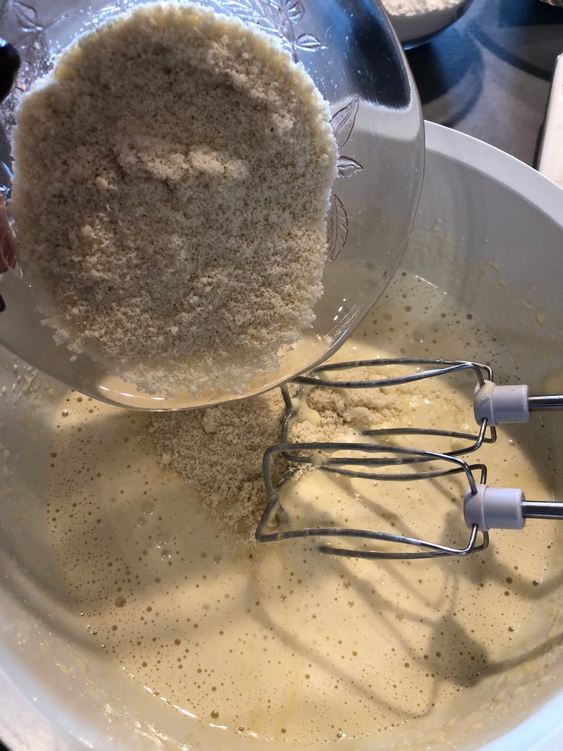 Unisco la farina setacciata con il lievito, un pizzico di sale e la polvere di vaniglia monto ancora qualche minuto