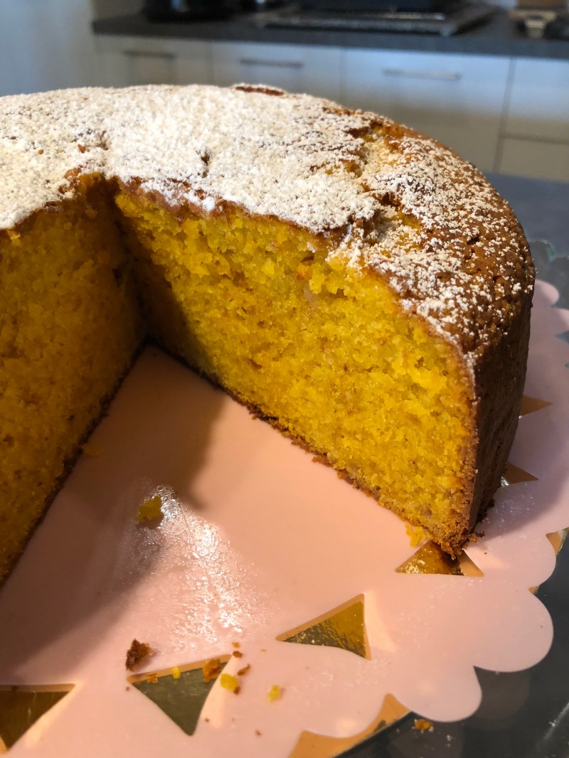 Inforno a 180 gradi per circa 50/60 minuti, se si colora troppo coprite con un foglio di alluminio controllate la cottura infilando la punta di un coltello al centro deve uscire asciutto, se non dovesse esserlo allungate i tempi di cottura per qualche minuto, la lascio intiepidire prima di toglierla dallo stampo, cospargo di zucchero a velo
