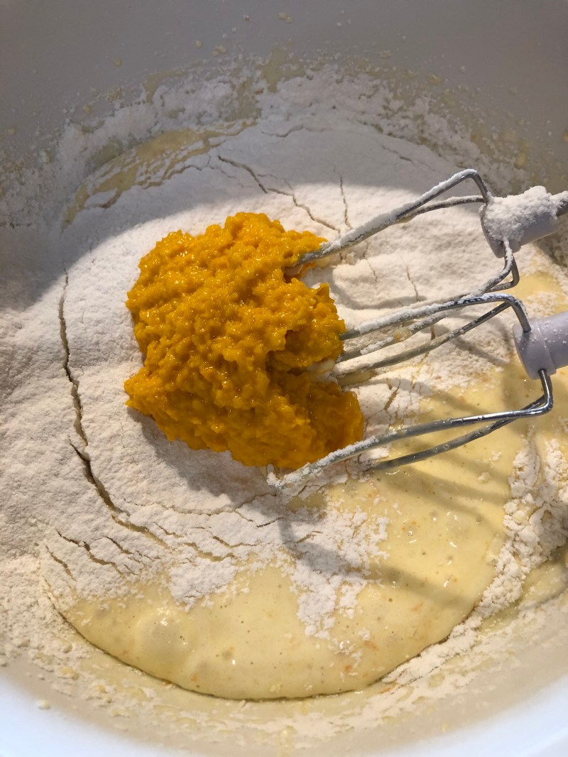 Aggiungo la farina alle uova montate alternandola con la polpa di zucca frullata