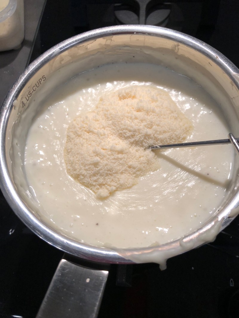 Nella maniera classica preparo la besciamella, sciolgo il burro, unisco la farina poi il latte, regolo di sale, pepe, noce moscata e mescolo bene senza formare grumi, lascio cuocere per una decina di minuti, aggiungo poi 2 cucchiai di parmigiano, io ho aggiunto un po’ più di latte perché volevo una besciamella molto morbida