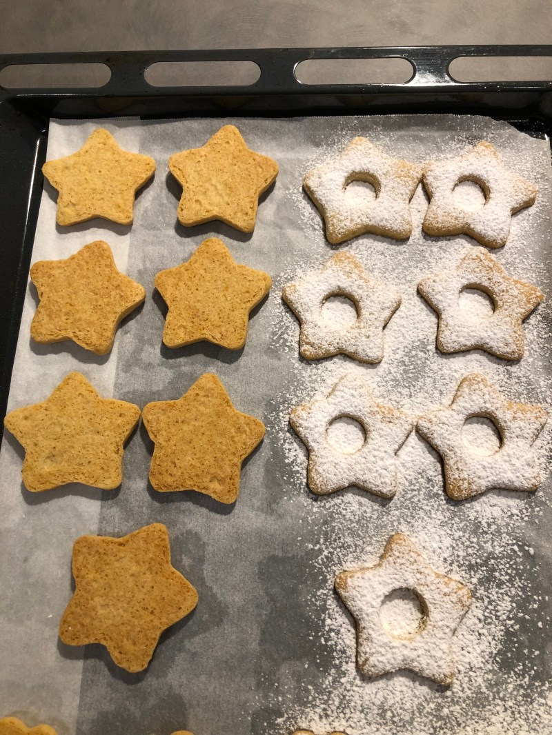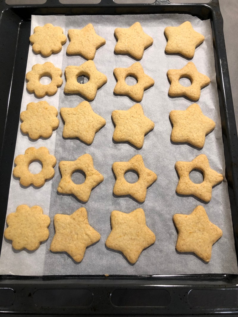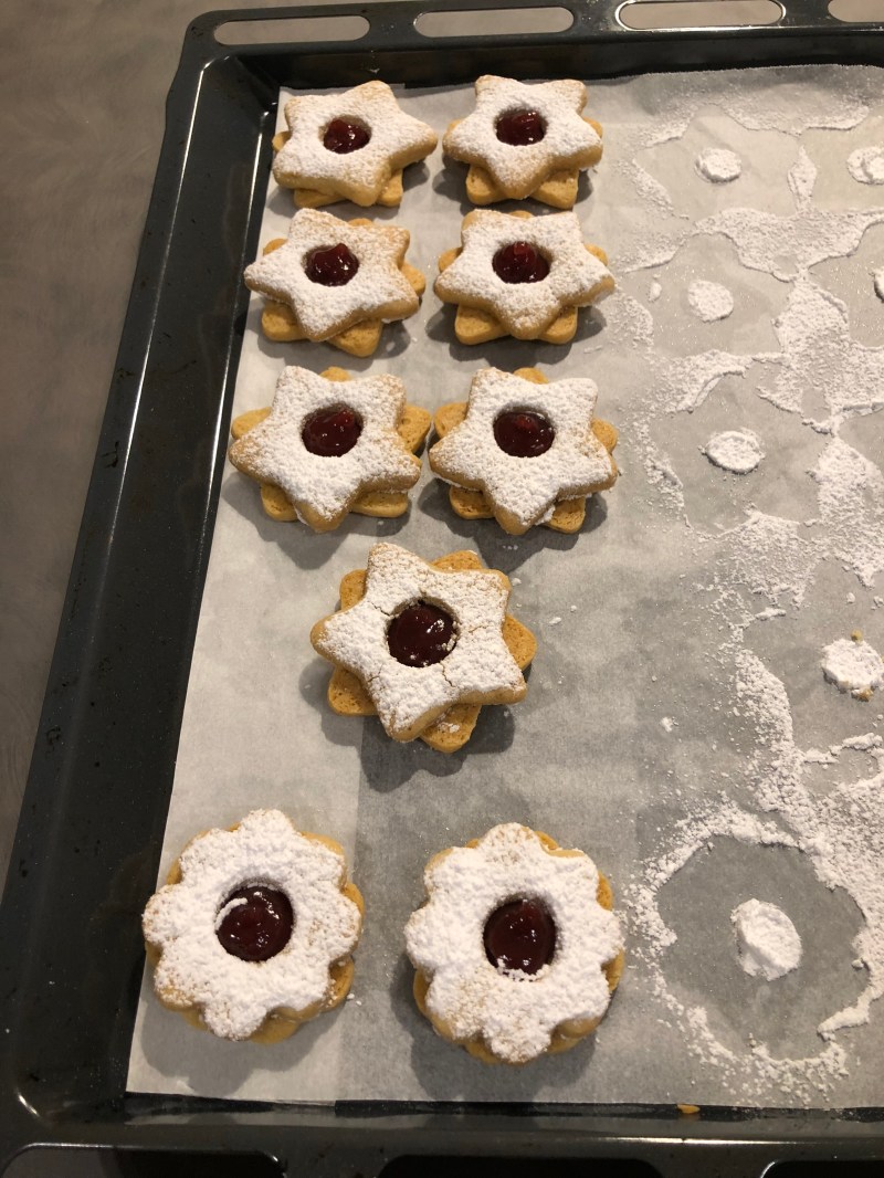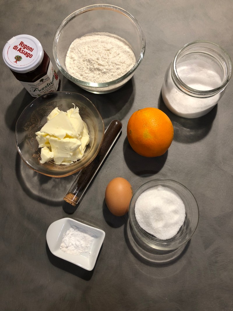 In una ciotolina batto l’uovo interoNe prendo solo 30 mlSetaccio la farina con il lievitoUnisco lo zucchero e la polvere di vanigliaAggiungo il burro e lavoro velocemente formando una sorta di briciole, aggiungo un pizzico di saleGrattugio la scorza di mezza aranciaVerso l’uovoLavoro velocemente gli ingredienti con le mani Fino ad ottenere un impasto omogeneoAppiattisco il panettoLo avvolgo nella carta forno o pellicola e metto in frigorifero per almeno mezz’oraQuindi la riprendoCon un matterello la stendo dello spessore di circa 5 millimetri, se avete pesato esattamente gli ingredienti e eseguito i passaggi correttamente non avrete bisogno di aggiungere farina, per agevolarvi potete appoggiare sopra un foglio di carta forno prima di stenderlaFormo i biscotti con l”aiuto di un coppa pastaLi dispongo in maniera ordinata su una placca ricoperta di carta forno, su metà dei biscotti dovete ritagliare un buco, questi saranno il coperchio dei biscottiI ritagli della pasta vanno compattati e stesi nuovamente ma vanno sempre raffreddati in frigorifero prima di riutilizzarliLi preparo tutti, intanto accendo il forno a 160 gradiLi cuocio per circa 15 minuti tenendoli controllati devono cuocere senza dorare troppoLascio raffreddare i biscotti poi quelli interi li capovolgo, mentre quelli con il buco li spolverizzo con zucchero a veloSopra ogni biscotto metto un ciuffetto di confettura che ho messo in un sac a pocheChiudo i biscotti appaiandoli fra loroLi conservo in un luogo fresco ed asciutto, una scatola di latta andrà benissimo