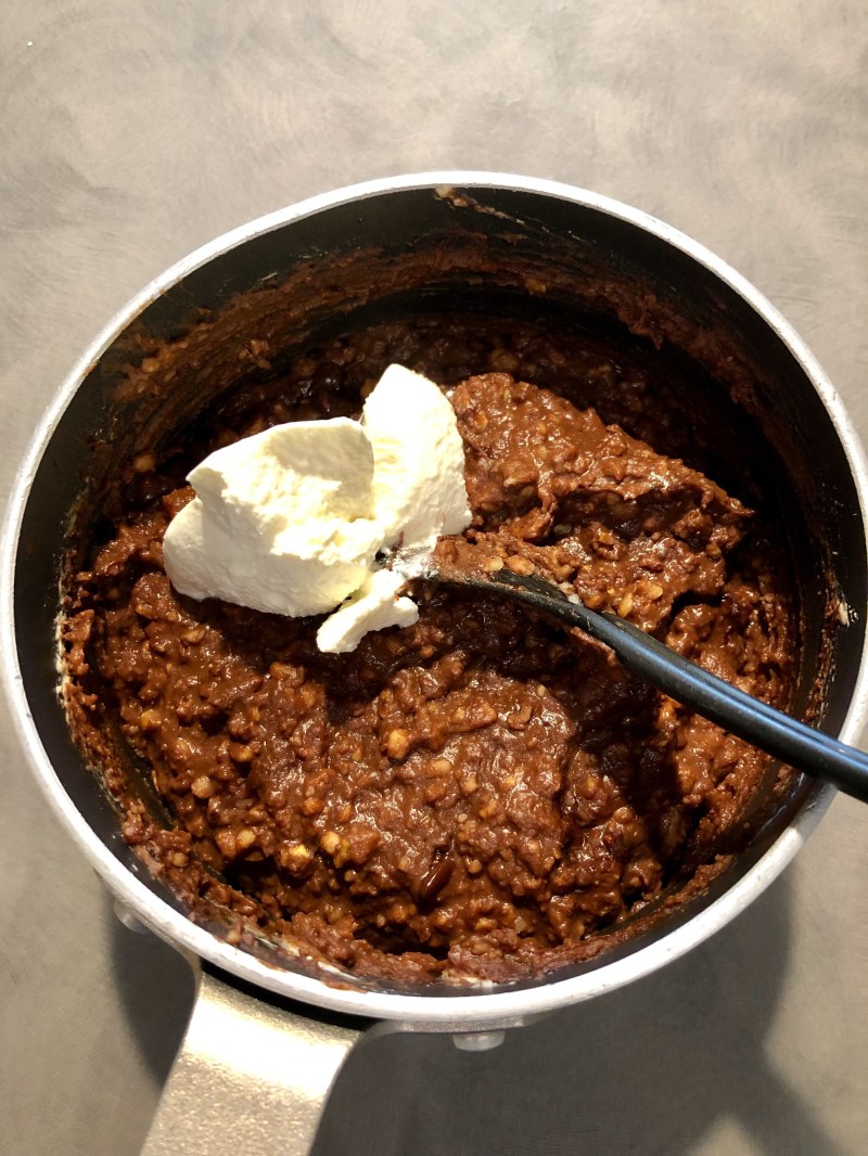 Mescolo bene finché il cioccolato si é sciolto, a questo punto unisco la ricotta