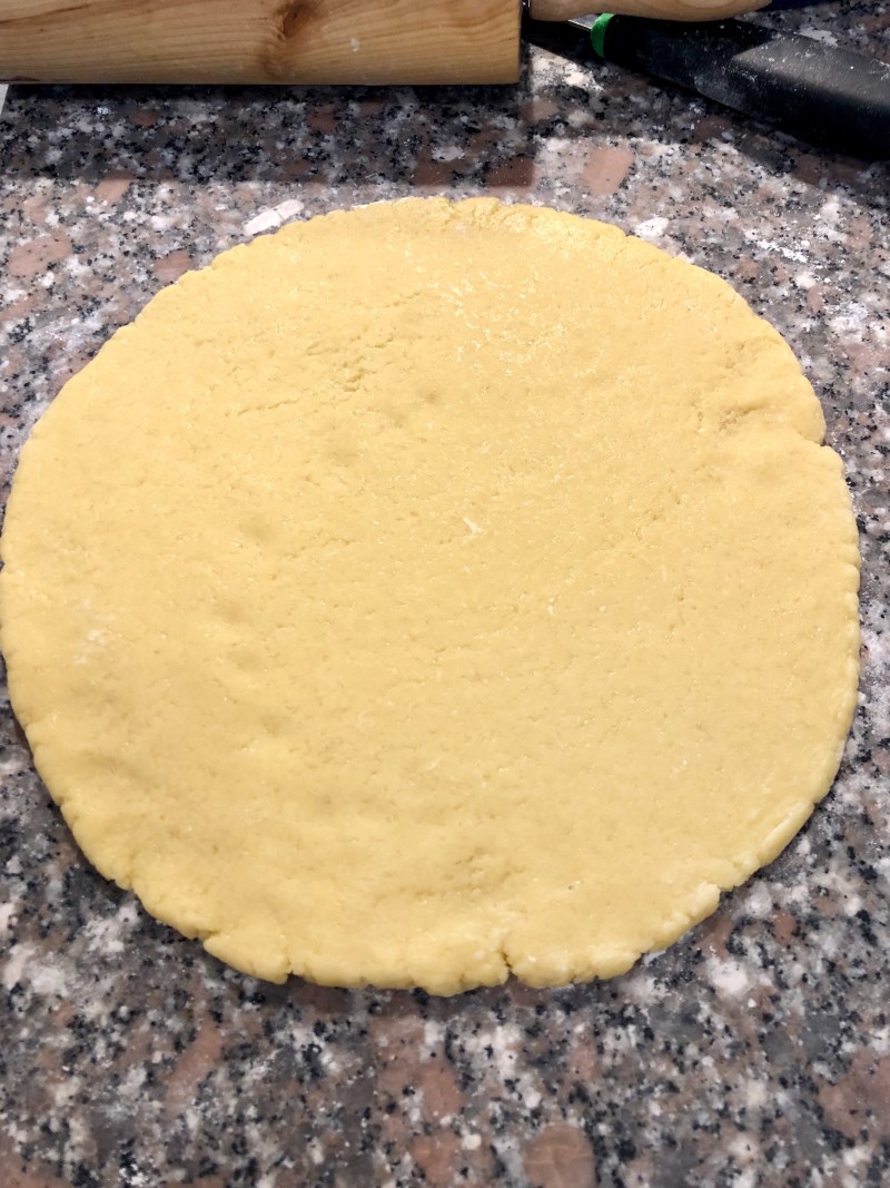 Tolgo la frolla dal frigorifero ne prendo un po’ più della metà e la stendo su di un piano leggermente infarinato, dando una forma tonda