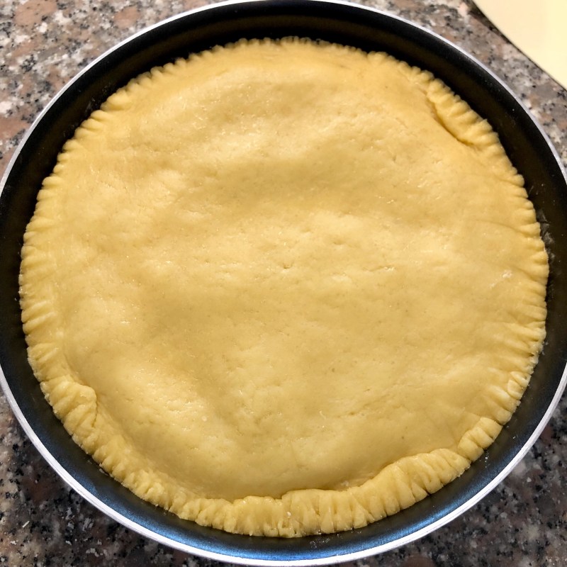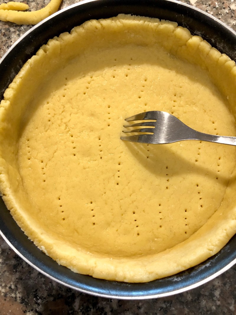 Rivesto una tortiera di 22 cm che ho precedentemente imburrato e infarinato lasciando un bordo poi bucherello con la forchetta