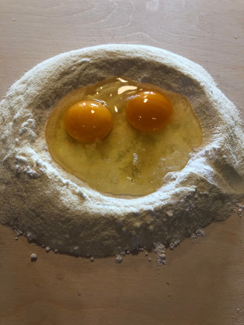Sul tagliere dispongo le farine a fontana facendo un incavo e rompendo le uova e un pizzico di sale
