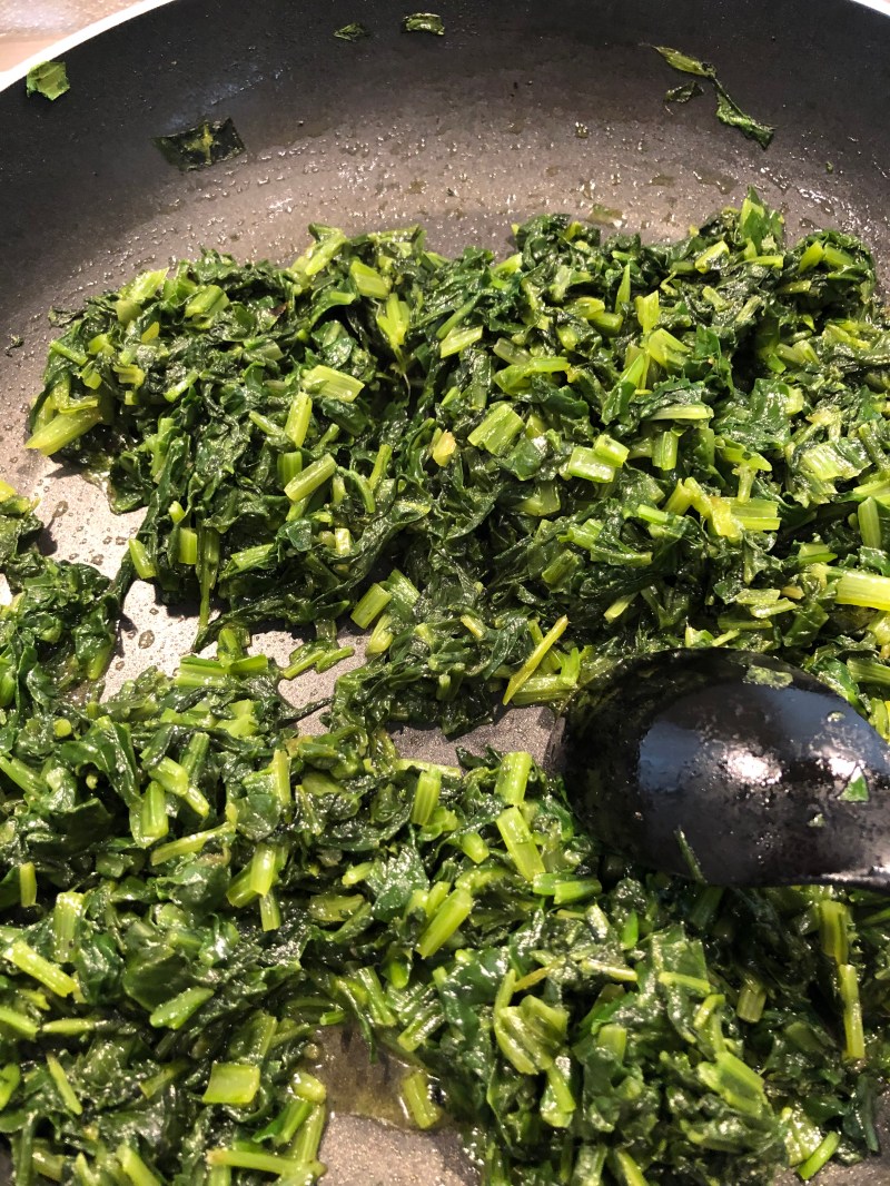 Intanto taglio le biete a striscioline, le cuocio in una padella con poco olio, uno spicchio di aglio, sale, pepe