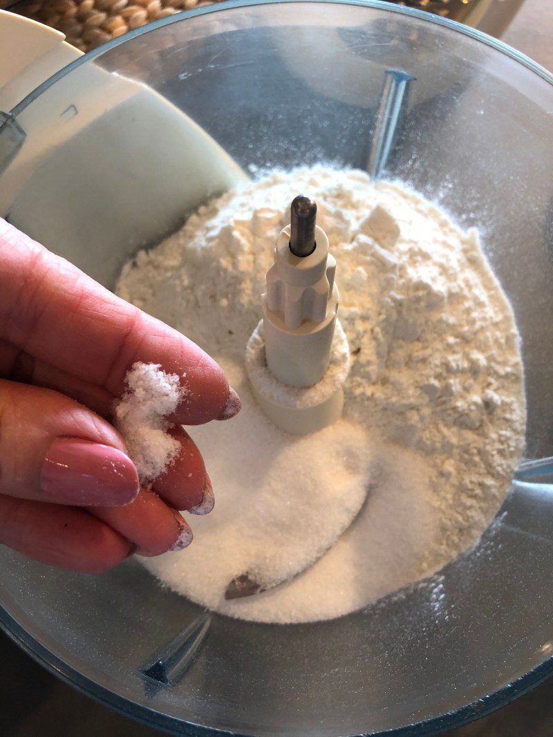 Intanto che la crema raffredda preparo la base, in un mixer o in una ciotola se decidete di impastare a mano verso la farina, lo zucchero e un pizzico di sale