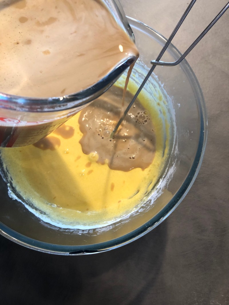 Mescolo bene per evitare grumi e verso il latte bollente poco per volta stemperando bene