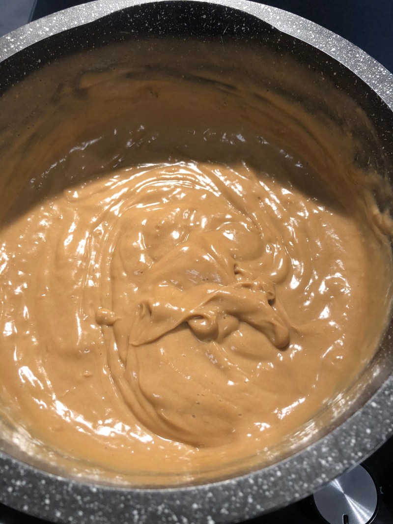 Verso il liquido in un pentolino e porto sul fuoco, la crema è pronta quando inizia ad addensare, mescolate bene