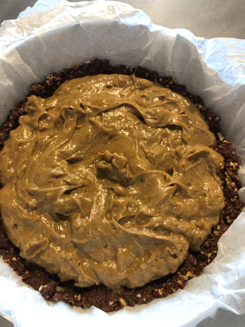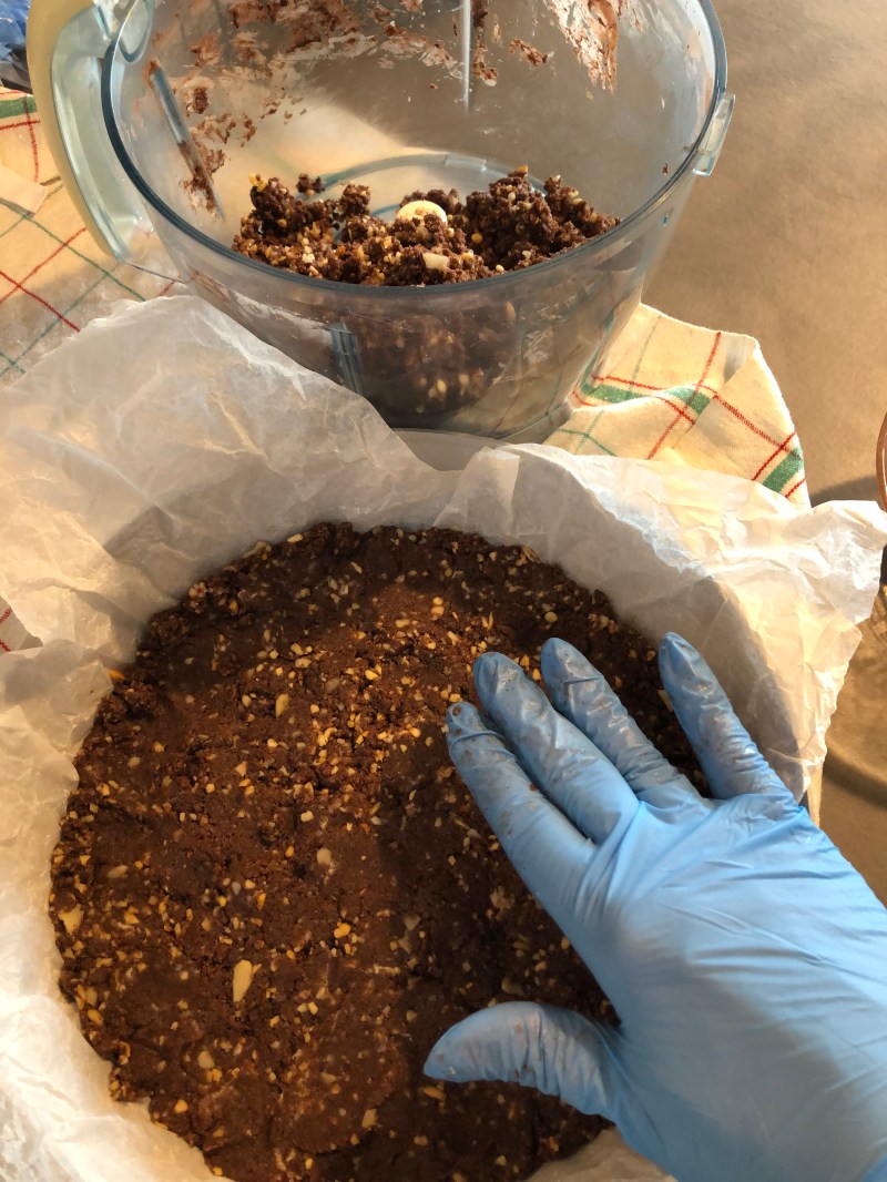 Rivesto il fondo di una tortiera con carta forno e distribuisco metà del composto pressandolo