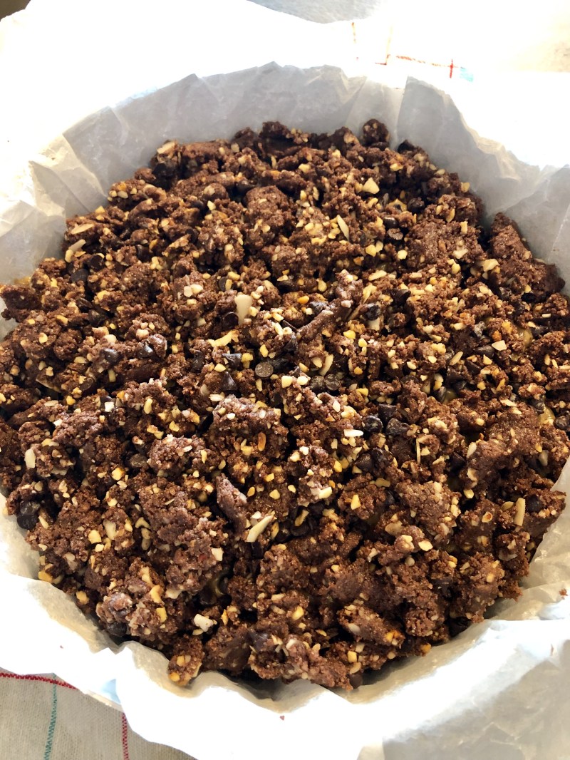Aggiungo le gocce che ho tenuto da parte al resto del composto, amalgamo e ricopro la torta coprendo accuratamente la crema