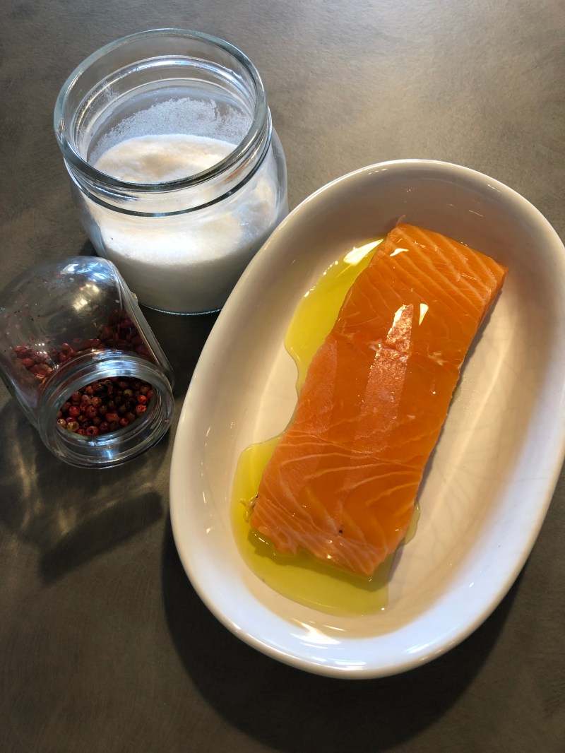 Lavo e asciugo il trancio di salmone e lo appoggio in un contenitore, controllo ed elimino eventuali lische