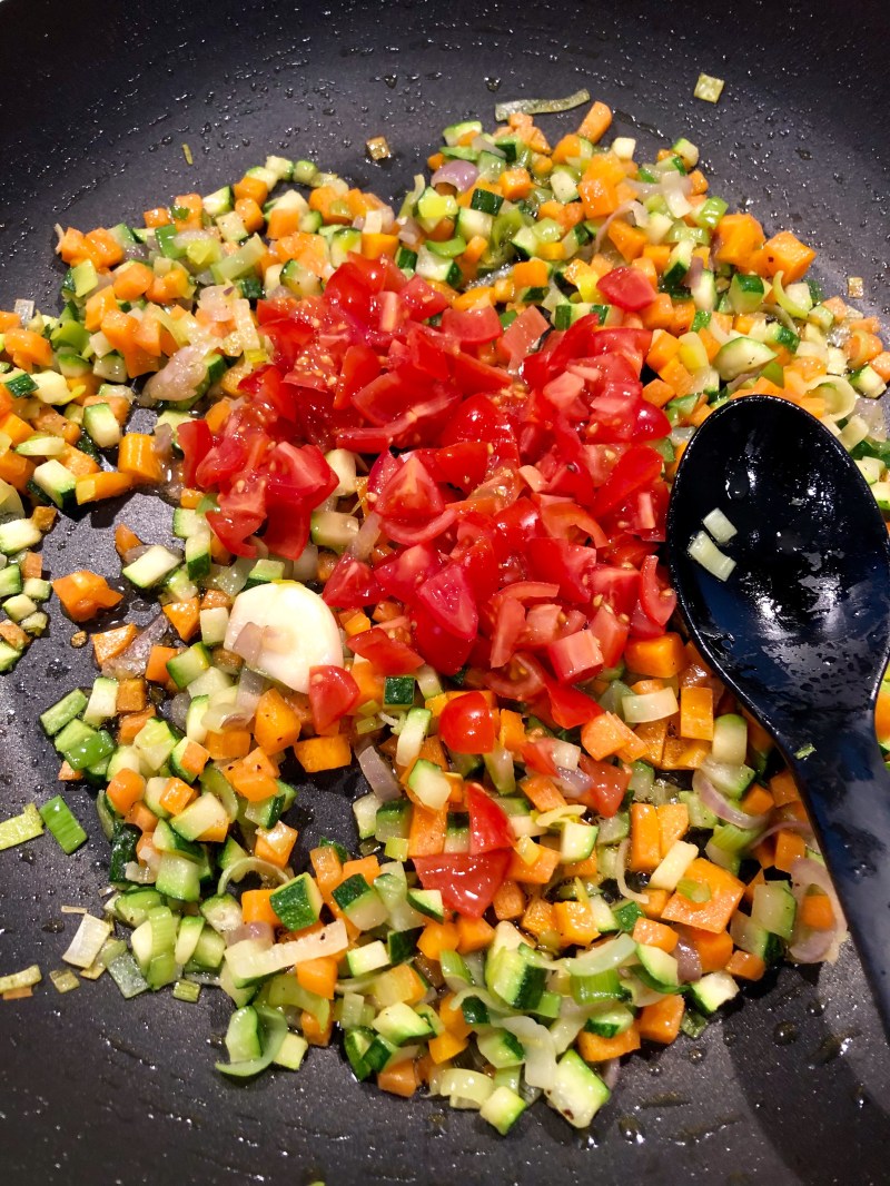 Due minuti prima di spegnere aggiungo i pomodorini cubettati ed elimino l’aglio