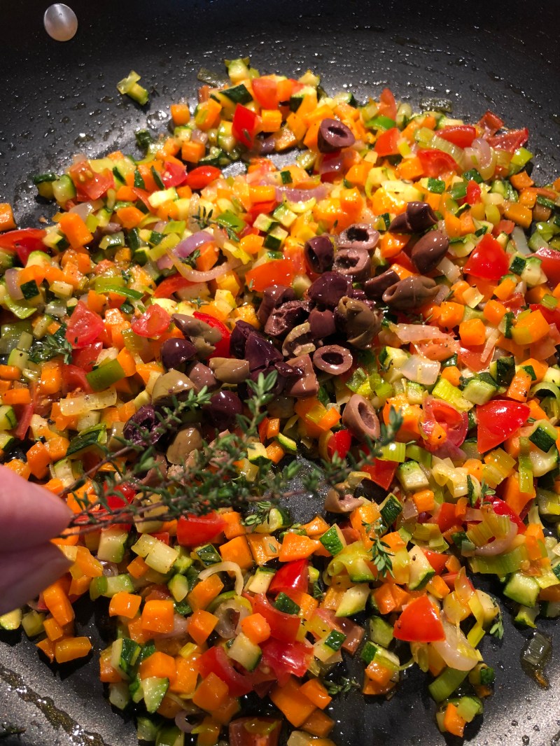 Spengo il fuoco e aggiungo le olive taggiasche tagliate a metà e il timo sfogliato