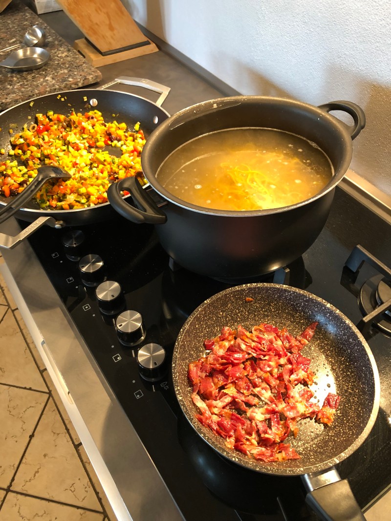 Un piatto fantastico che vi darà grande soddisfazione, dei tagliolini già buoni al naturale con olio extravergine e parmigiano, arricchiti poi da verdure croccanti e dalla pancetta avranno una marcia in più e faranno la differenza