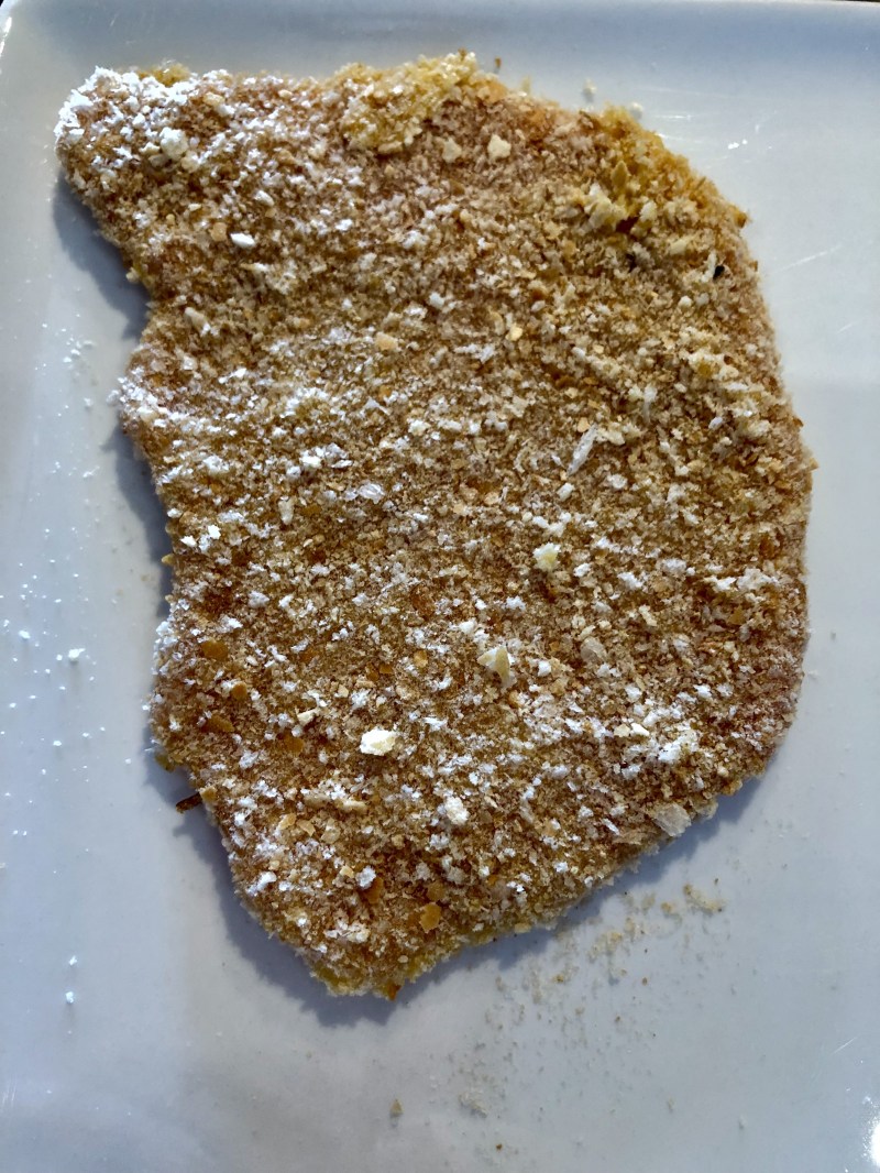 In una ciotola batto 2 uova, in un piatto verso qualche cucchiaio di farina 00 e in un altro piatto del pane grattugiato finemente