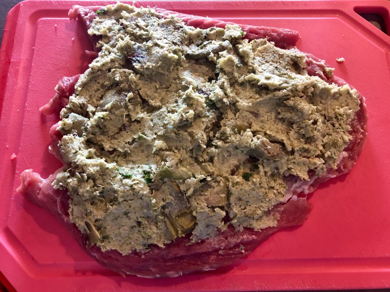 Pulisco il filetto da eventuali parti grasse e lo apro a libro, lo batto leggermente per ottenere una superficie piatta, distribuisco la farcia