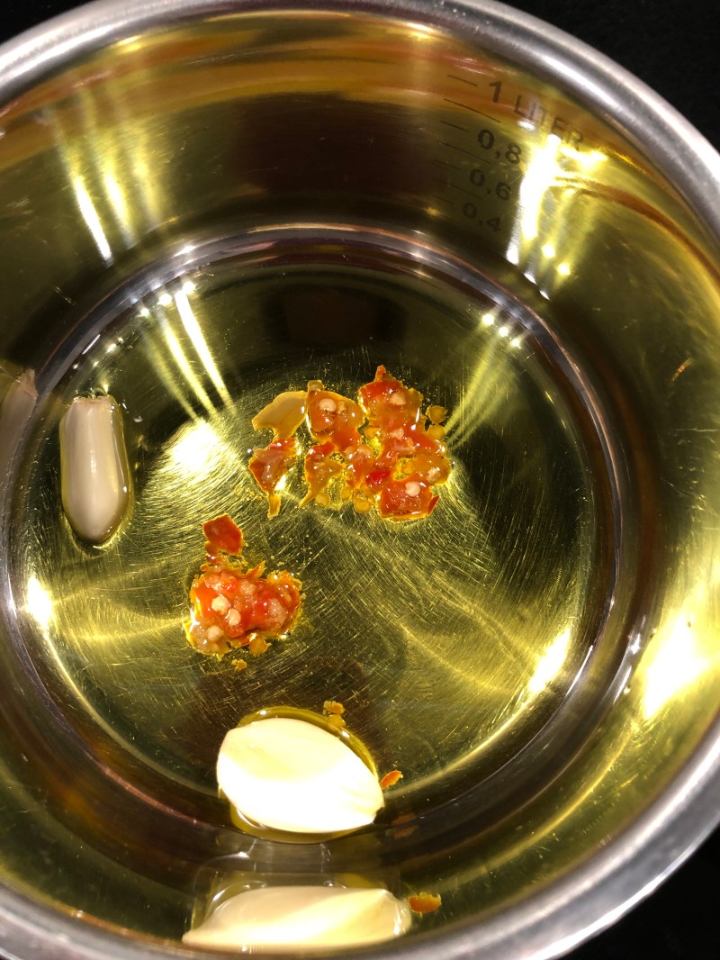 In un pentolino verso l’olio extravergine, lo spicchio di aglio e un cucchiaino di peperoncino, decidete voi più o meno piccante