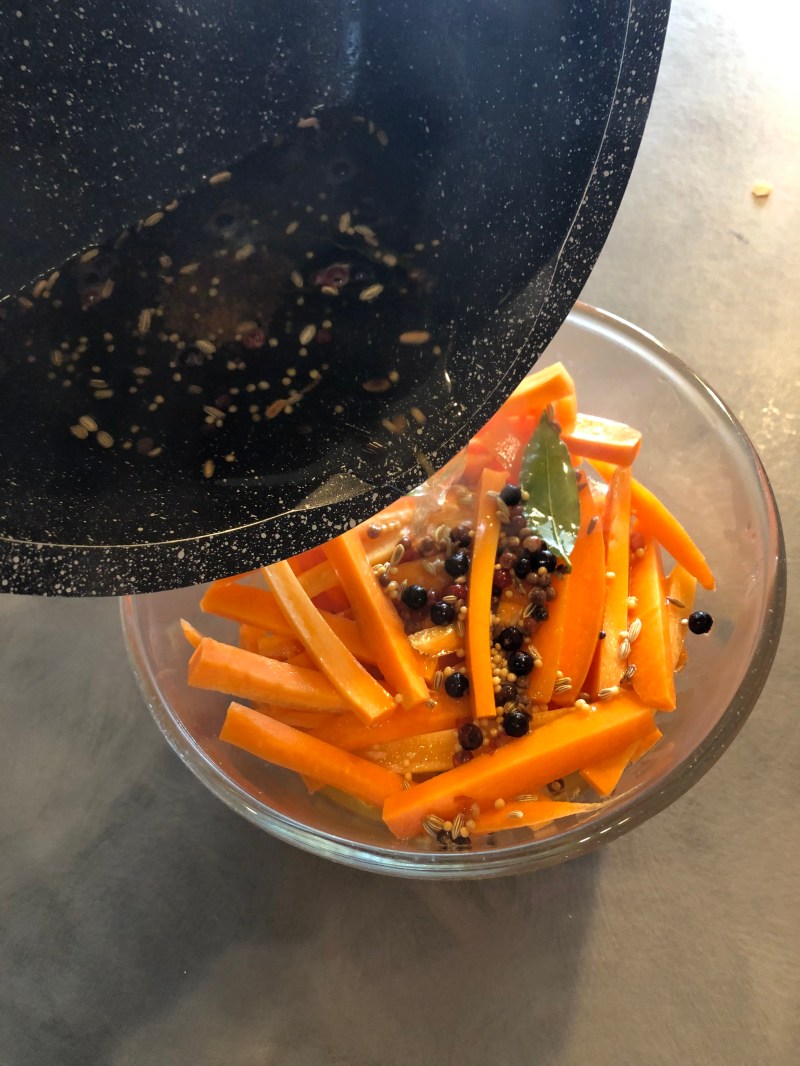 Porto a bollore mescolando in modo che il sale il miele siano sciolti, verso il liquido con tutti gli aromi sulle carote