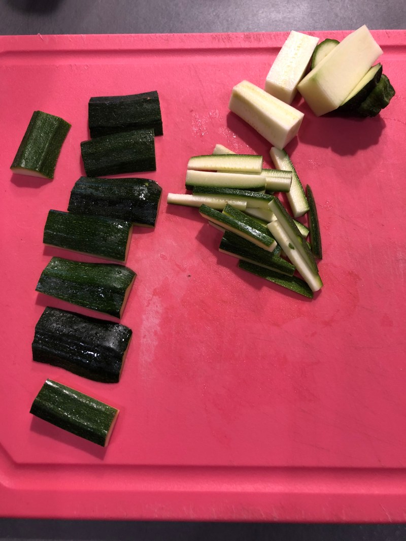 Elimino la parte centrale delle zucchine e le taglio a bastoncino