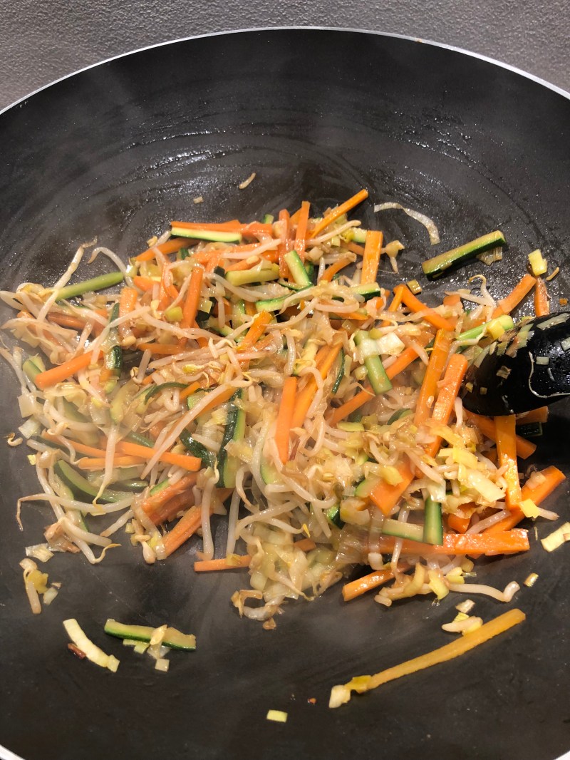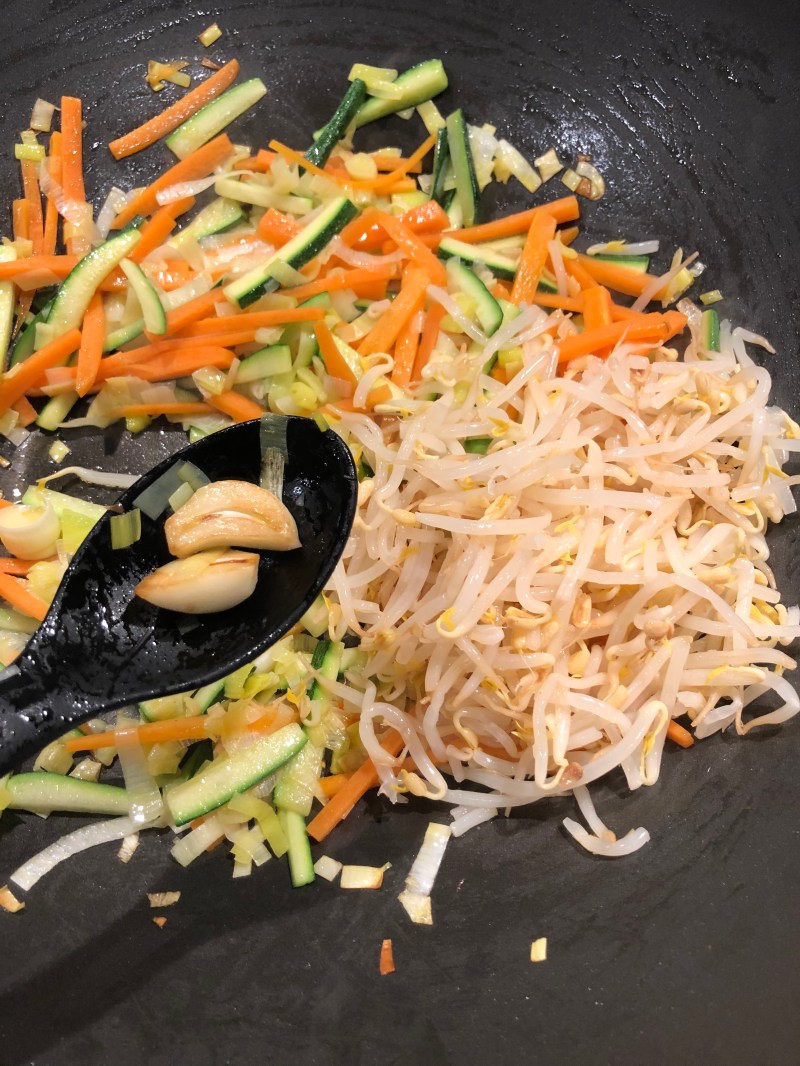 In una wok verso l’ olio, lo spicchio di aglio e lo scaldo bene e verso le verdure e le lascio cuocere a fiamma vivace lasciandole croccanti