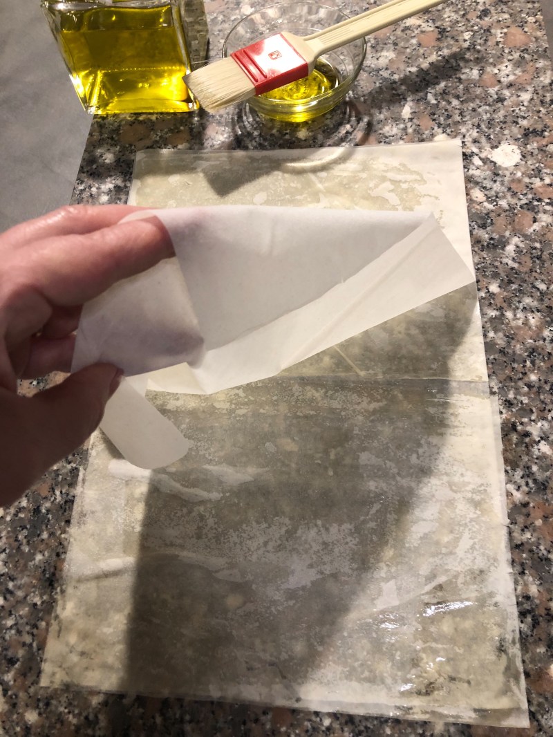 Stendo un foglio di pasta fillo e spennello tutta la superficie di olio