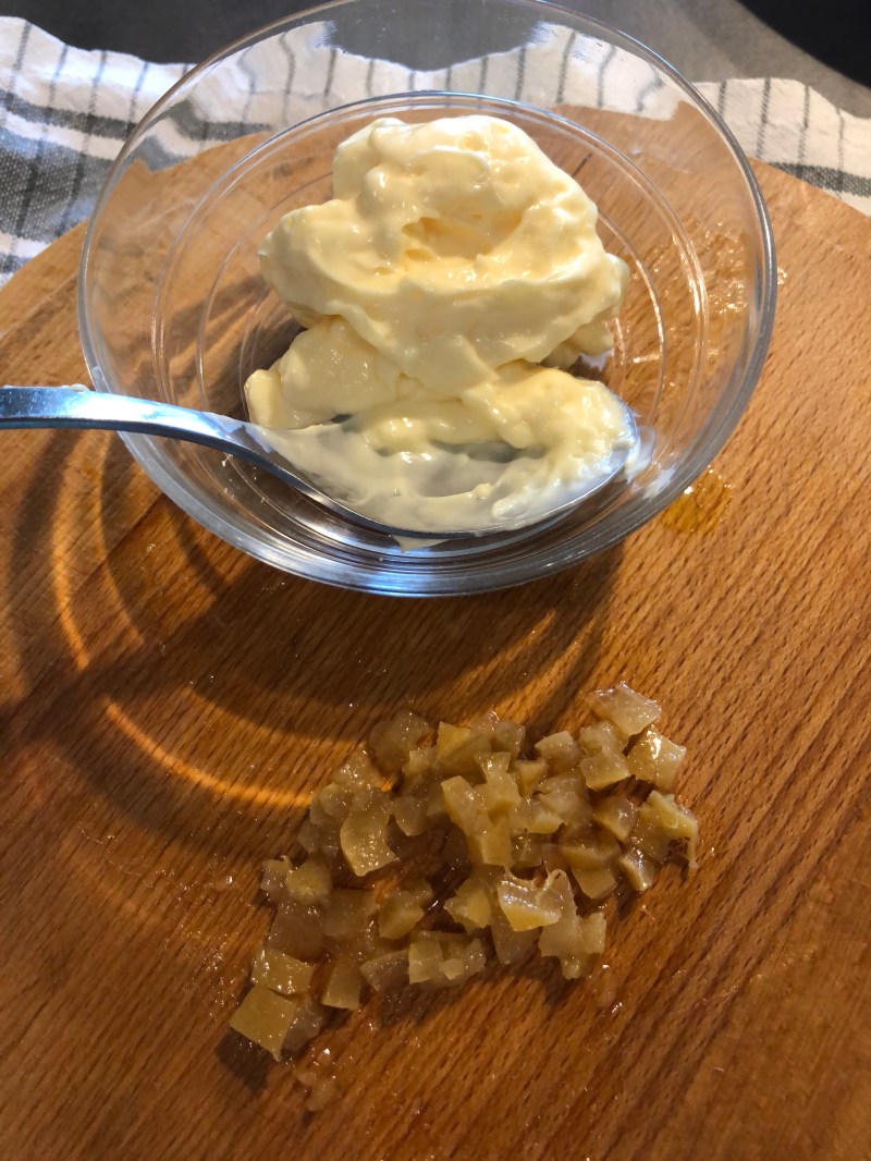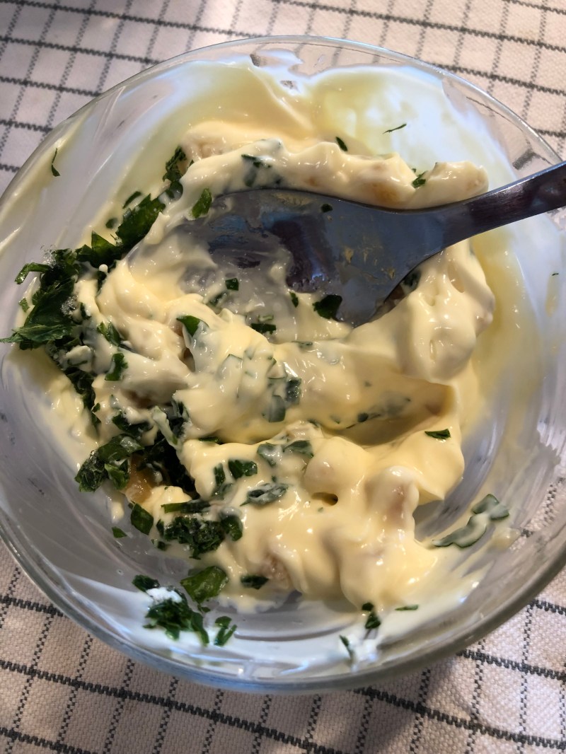 In una ciotolina metto la maionese con il limone sotto sale tritato, se non lo avete la buccia di un limone biologico