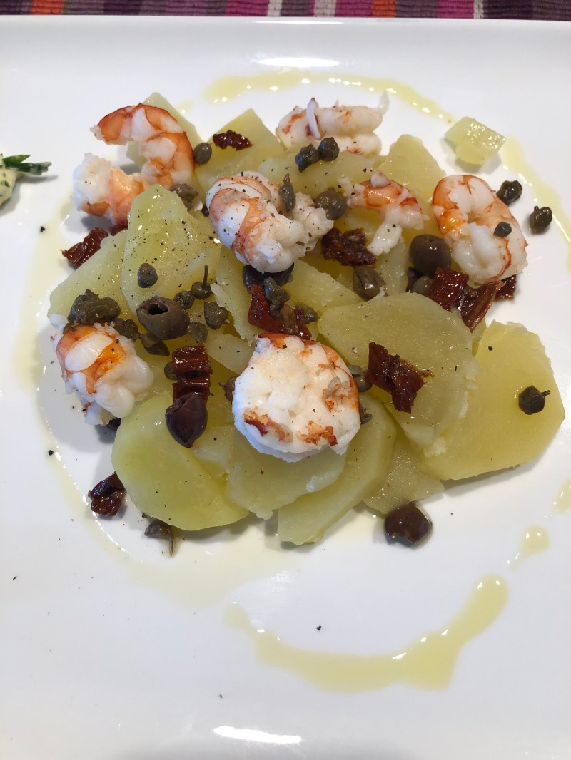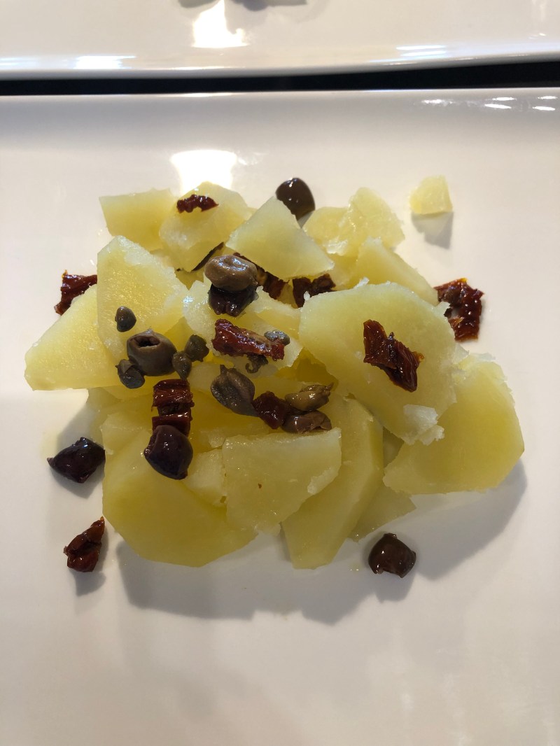 In un piatto dispongo la metà delle patate con le olive, i capperi e i pomodorini tagliuzzati