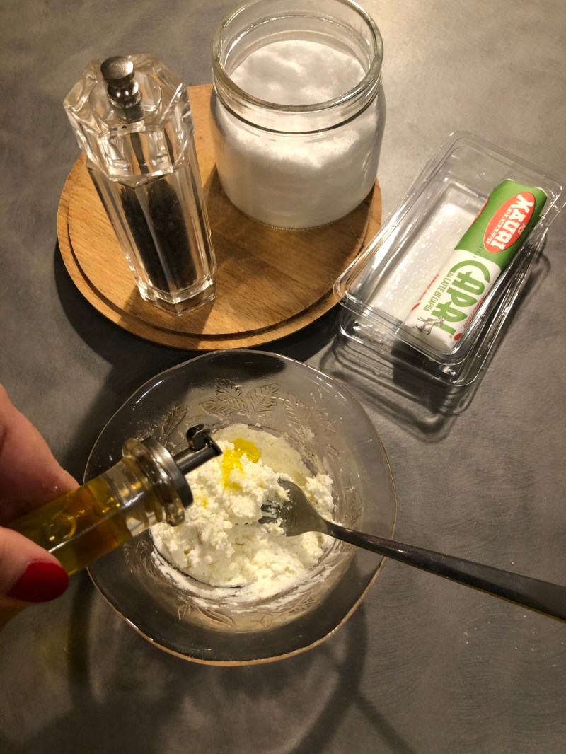 Verso il caprino in una ciotola, aggiungo poco sale, pepe, olio extravergine e buccia grattugiata di limone