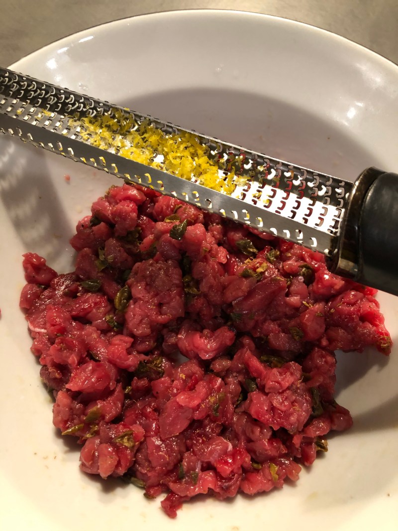 Verso la carne in una ciotola, aggiungo i capperi, sale e pepe e condisco con olio extravergine