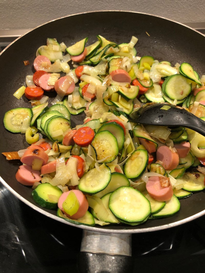 In una padella verso dell”olio extravergine, aggiungo le zucchine tagliate a fettine e il porro