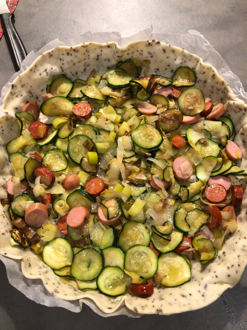 Una torta salata gustosa una ricetta svuota frigo, ho infatti utilizzato dei würstel che avevo avanzato, potete utilizzare speck, pancetta, prosciutto quello che preferite, ottima come antipasto o un pranzo.Ho utilizzato la sfoglia Buitoni con i semi che trovo ottima