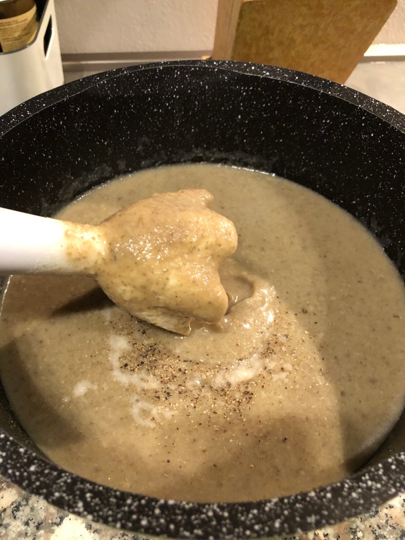 Lascio cuocere per circa 30 minuti, controllo che le patate siano cotte e il brodo assorbito, non ne lascio troppo altrimenti la crema resterà troppo liquida, ne conservo invece che aggiungo in caso di bisogno, frullo con il mixer ad immersione e aggiungo una macinata di pepe