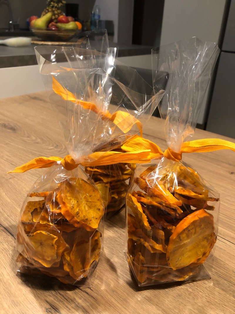 Chiudo con il coperchio e avvio l’essiccatore a 40 gradi per circa 14 ore, a metà tempo li giro e inverto la disposizione dei cestelli, dovete controllare, devono rimanere belli asciutti, il tempo dipenderà dallo spessore e della quantità di acqua contenuta nei frutti, in caso allungo i tempi di essiccatura