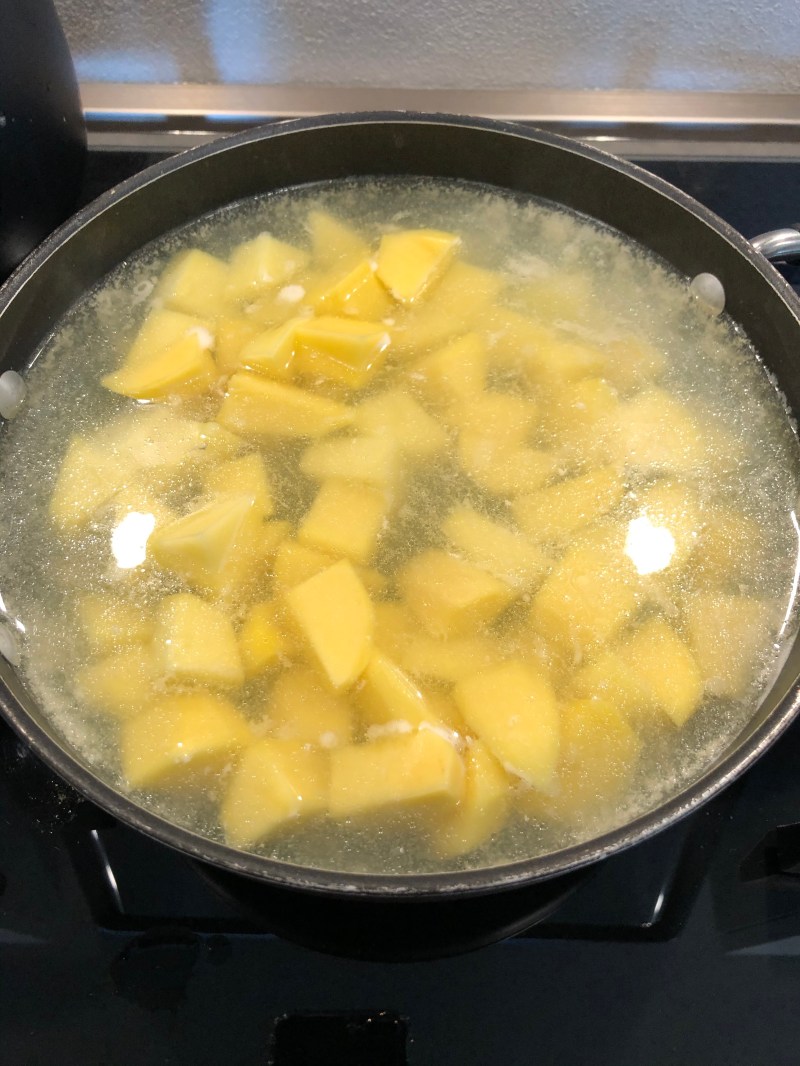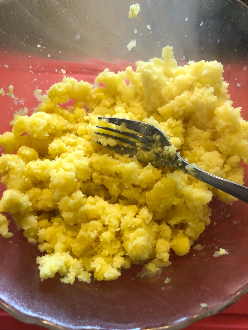 Quando sono cotte le scolo, le verso in una terrina e le schiaccio con una forchetta